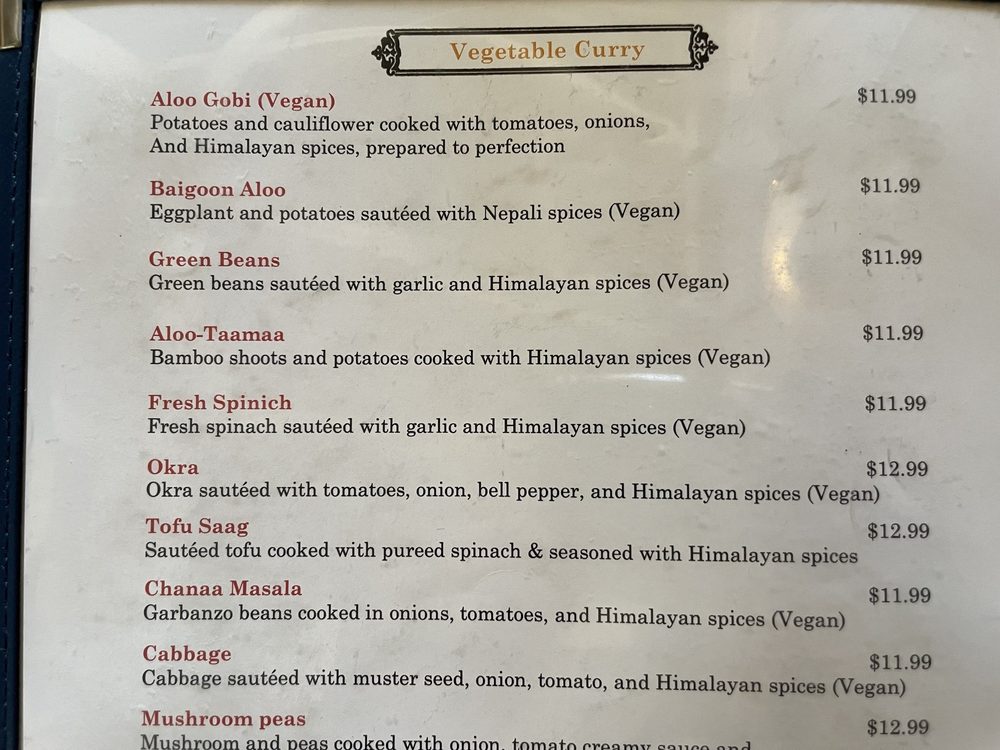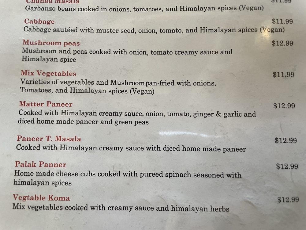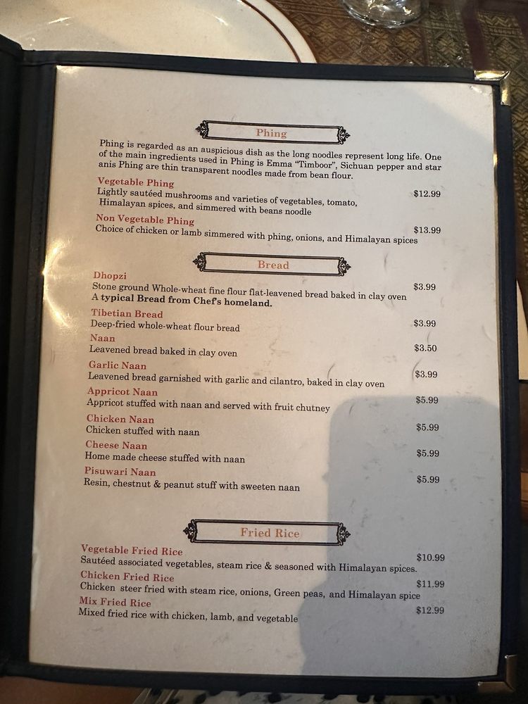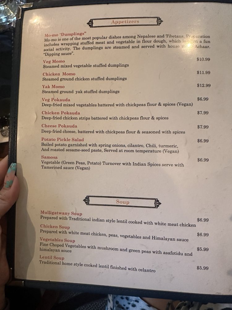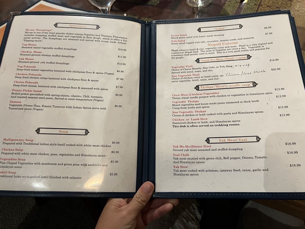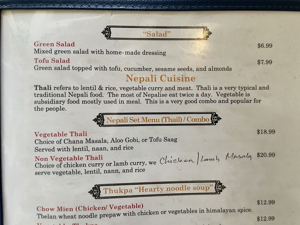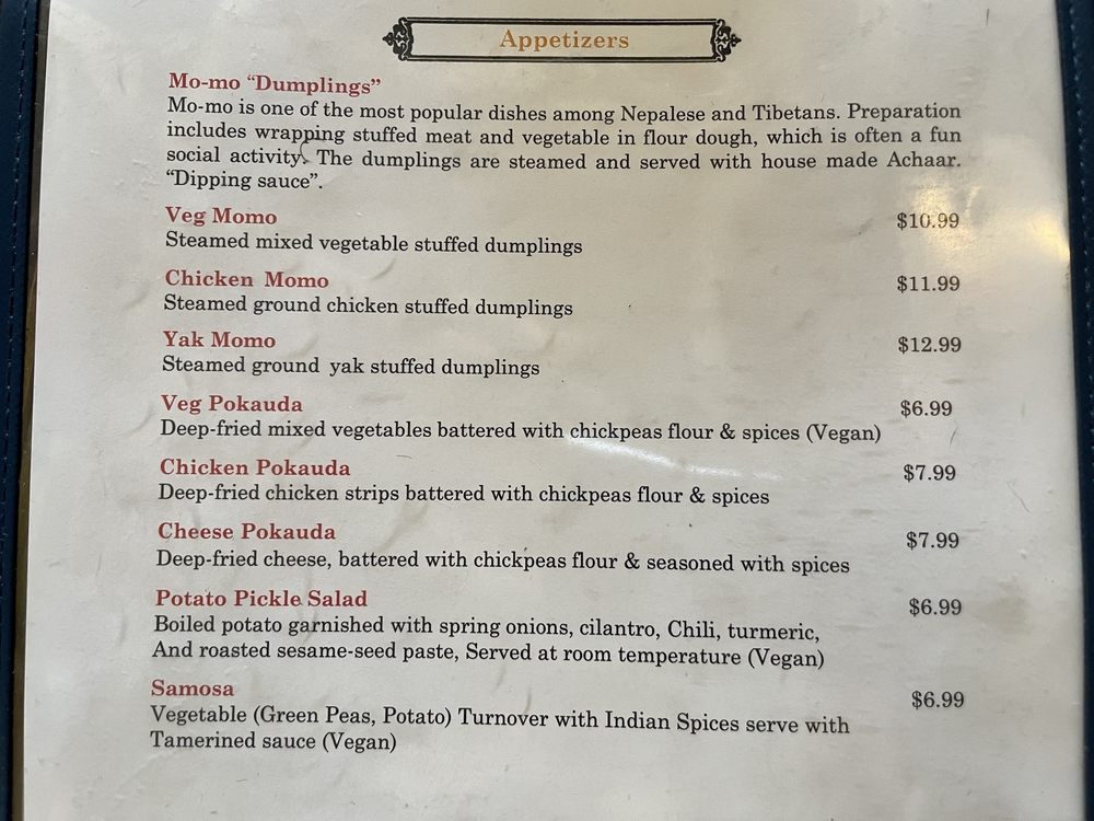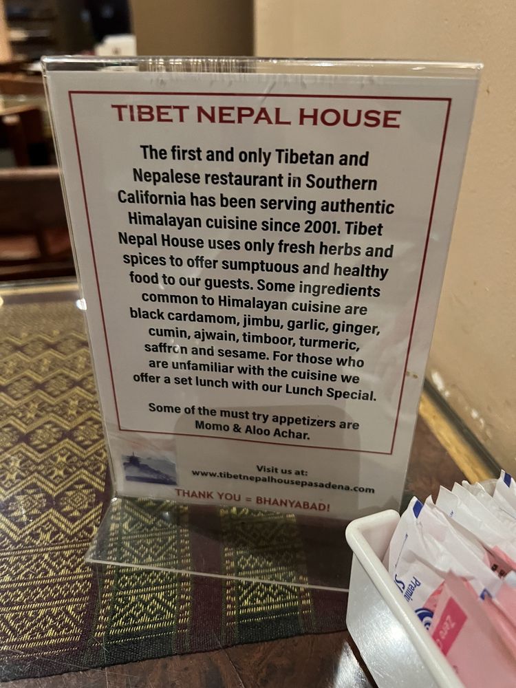 At Tibet Nepal House, located in Pasadena, CA, you can indulge in a fusion of Nepalese and Tibetan cuisine. The menu boasts delicious appetizers like the Chicken MoMo and Yak MoMo dumplings, along with hearty soups like Mulligatawny Soup and Lentil Soup. For a lighter option, try the Green Salad or Tofu Salad. Customers rave about the savory dishes, such as the Chicken Tikka Masala and Lamb Curry Thali, complemented by sides like perfectly fried samosas and garlic naan. The ambiance is cozy and welcoming, perfect for a quiet lunch or dinner with friends and family. With vegan and vegetarian options, along with gluten-free choices, Tibet Nepal House caters to a variety of dietary preferences. Don't miss out on the unique flavors and inviting atmosphere of this hidden gem!