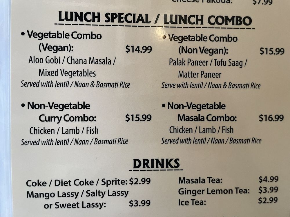 Choice of Chana Masala, Aloo Govi or Tofu Saag . We serve a vegetable ,lentils, naan and rice